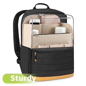 Well Constructed: The backpack Insert Organizer with two large zipper pockets that protect your files, tablet PCs, and laptops. Also have enough place for everyday items such as water bottles, phones, umbrellas, lipsticks, pens, wallets, keys, glasses, kindle,iPad, cosmetics, tissue, tickets, cash, and notebooks. The backpack is upright and manages all items in good order and prevents them from slipping and scattering.
