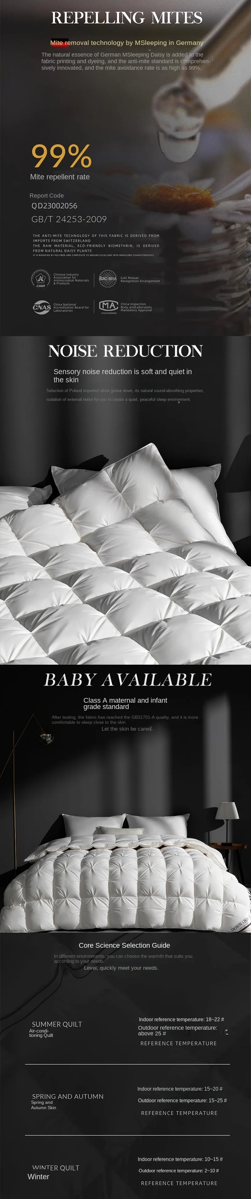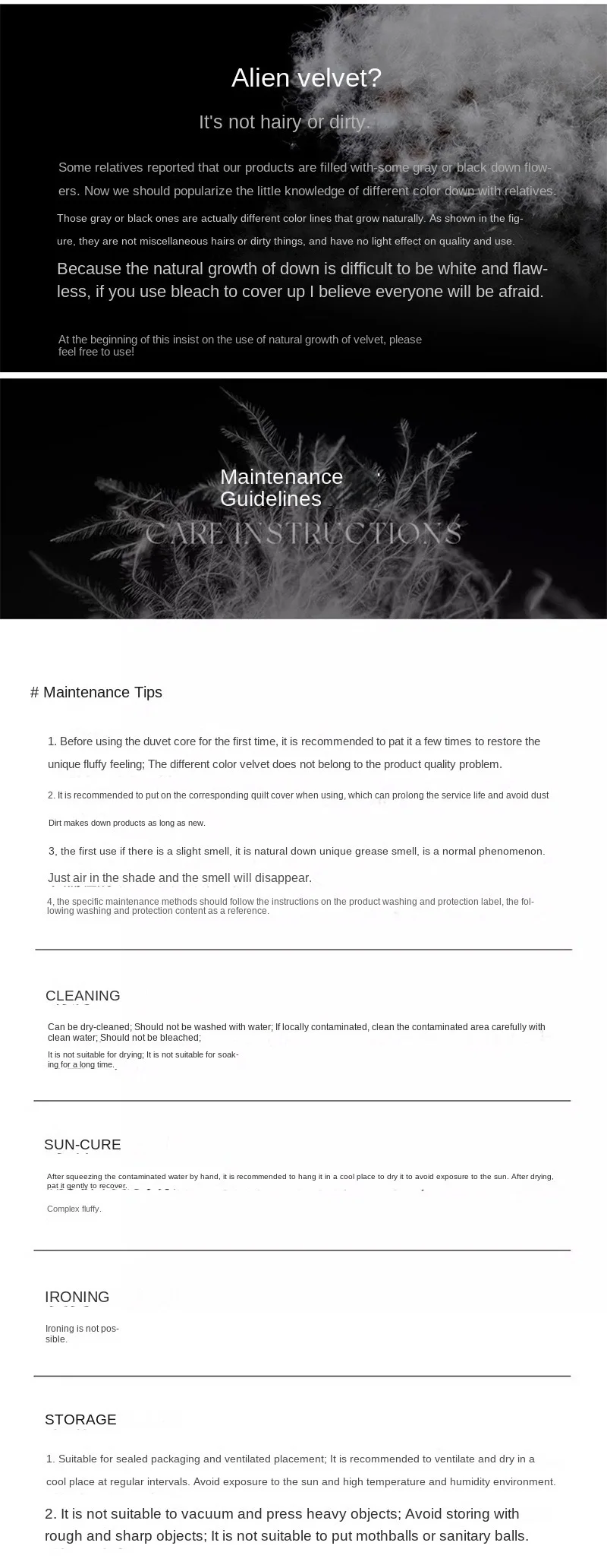 Before storage, ensure the duvet is fully dry. Gently pat it for a while to remove surface dust, then store it in a well-ventilated place with an appropriate amount of insect repellent.