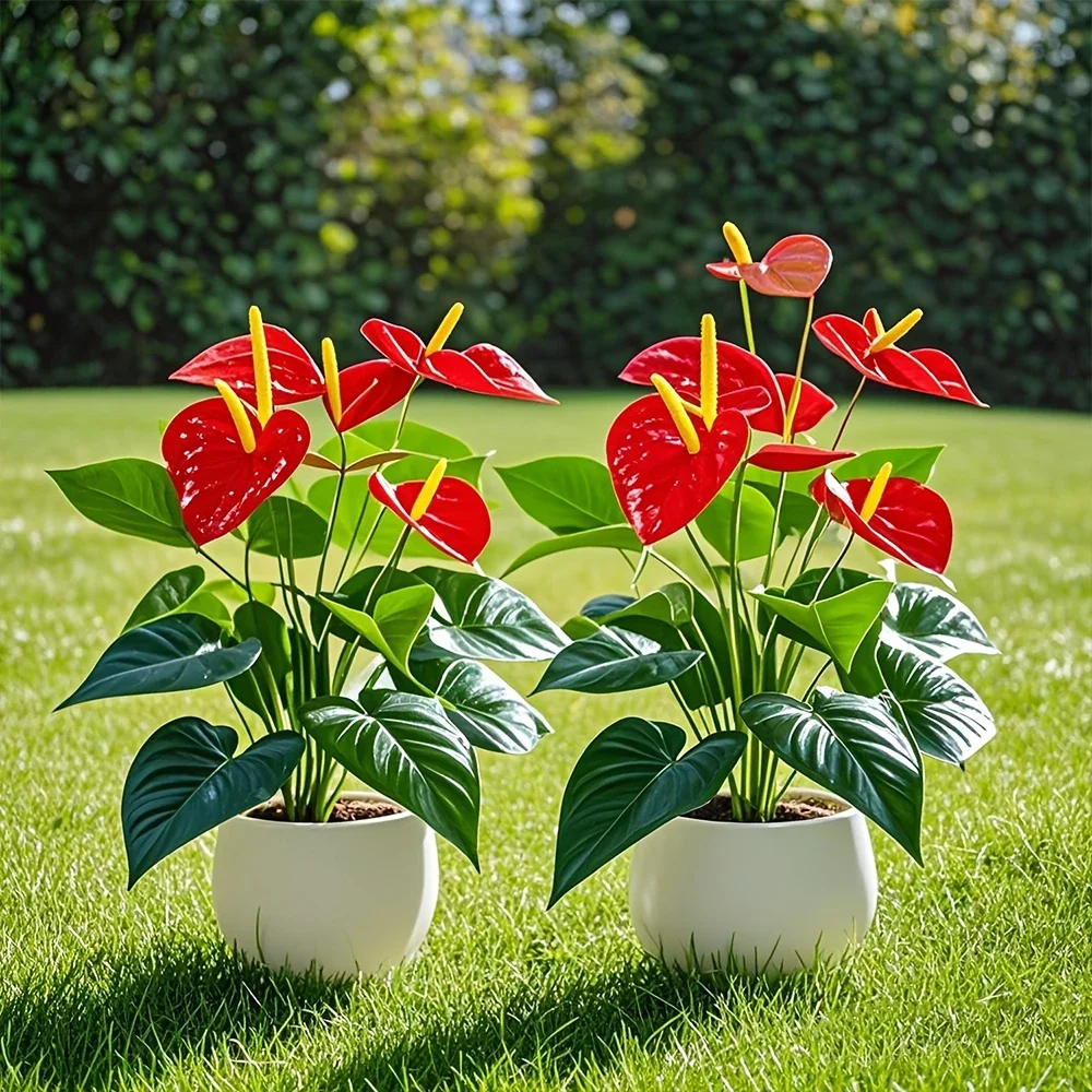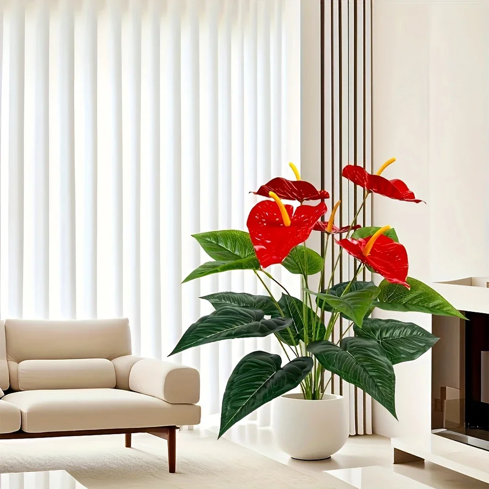 12-Headed Red Palm Artificial Flowers Flamingo Flower with Lush Green Leaves Fake Plants for Room Home Garden Outdoor Decoration