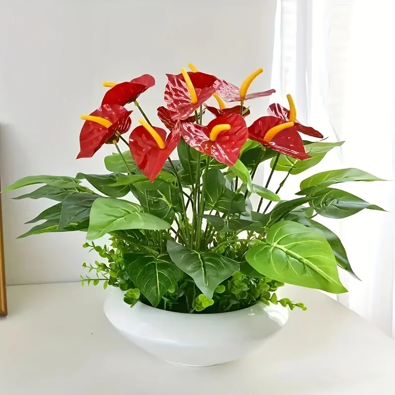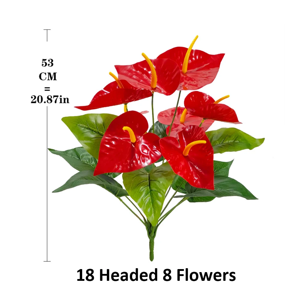 12-Headed Red Palm Artificial Flowers Flamingo Flower with Lush Green Leaves Fake Plants for Room Home Garden Outdoor Decoration