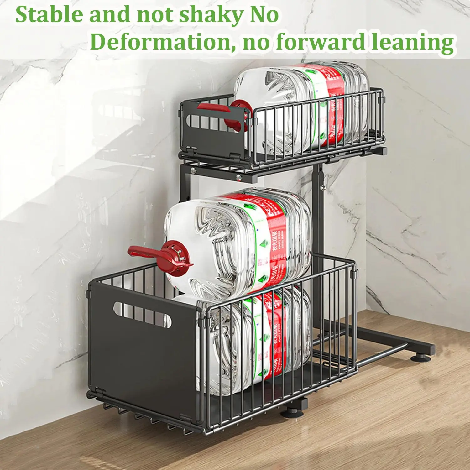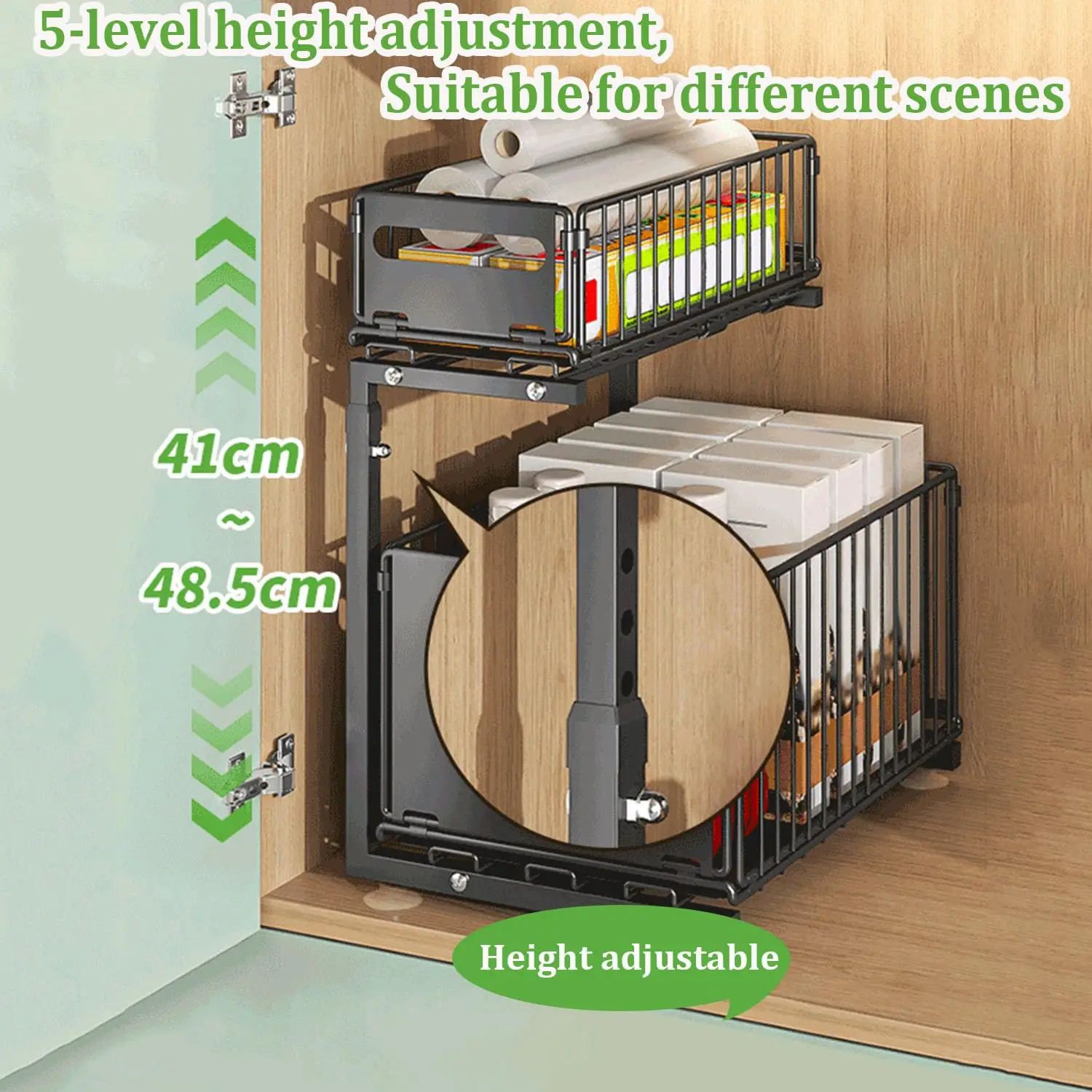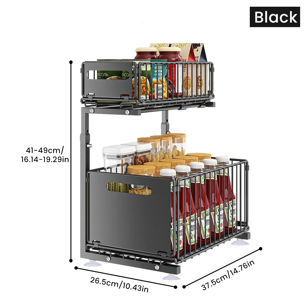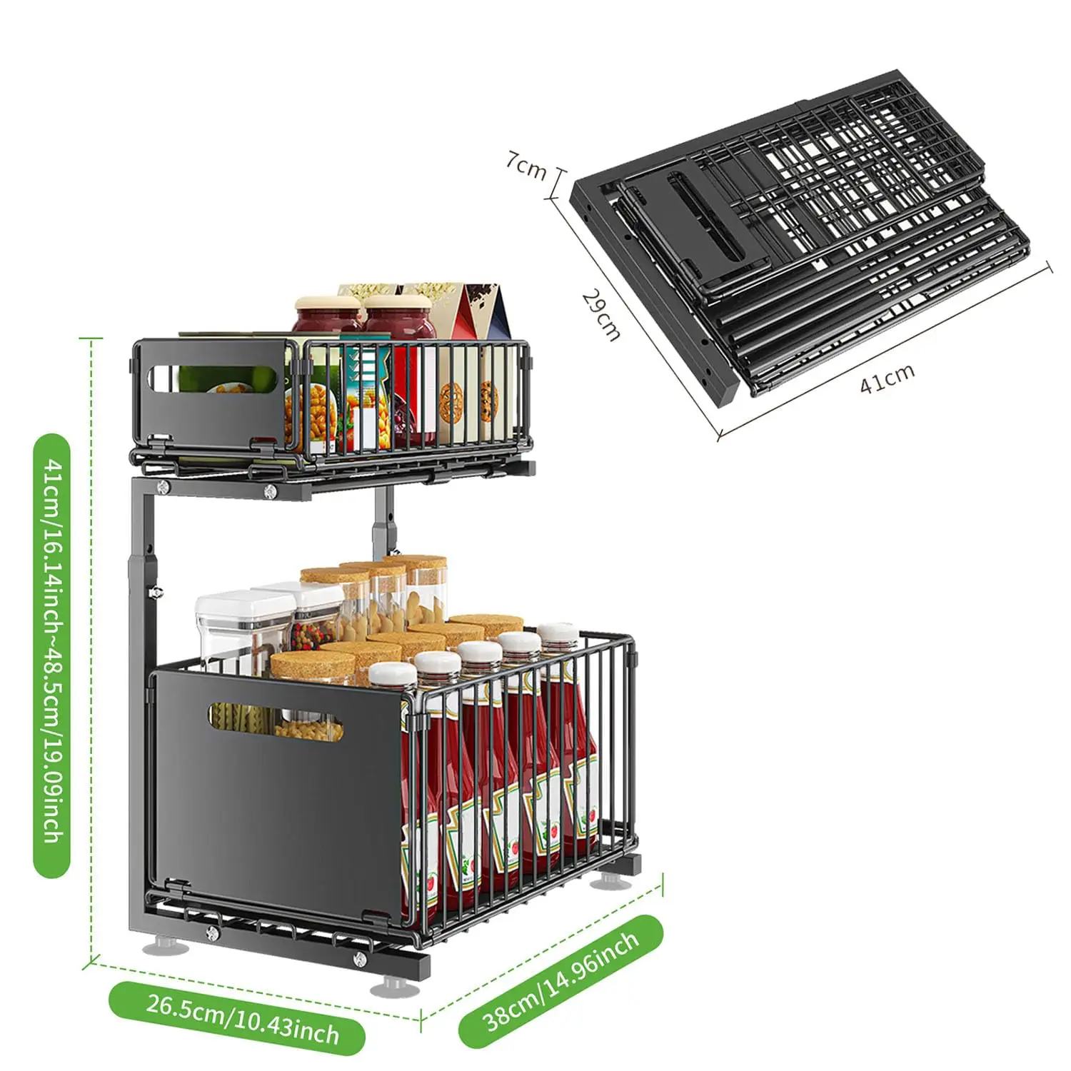 Maximize every inch of your cabinet space with this 2 tier pull out cabinet organizer. Both layers slide out smoothly and individually, allowing you to easily reach items stored at the back. No more bending or digging through clutter — just pull, organize, and find everything in seconds.
