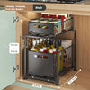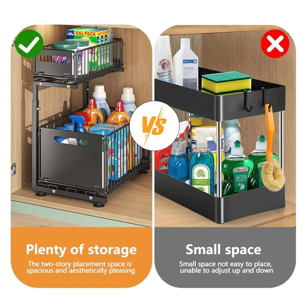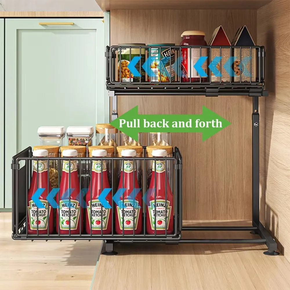 Maximize every inch of your cabinet space with this 2 tier pull out cabinet organizer. Both layers slide out smoothly and individually, allowing you to easily reach items stored at the back. No more bending or digging through clutter — just pull, organize, and find everything in seconds.