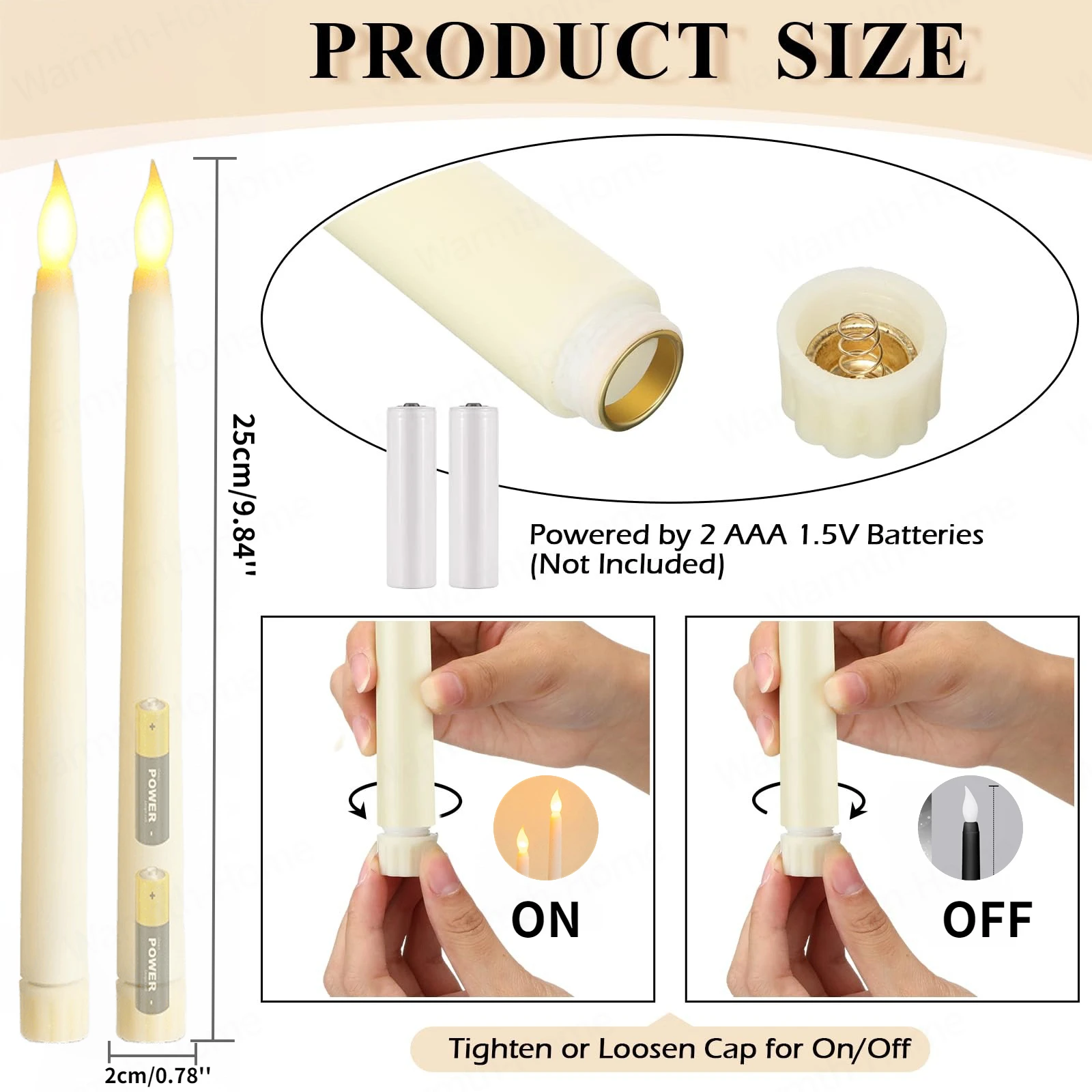 Each led candles flickering measures about 11 x 0.8 inch, suitable for all standard and glass taper candlesticks, each LED candle needs 2 AAA batteries (not included in package), easy to replace