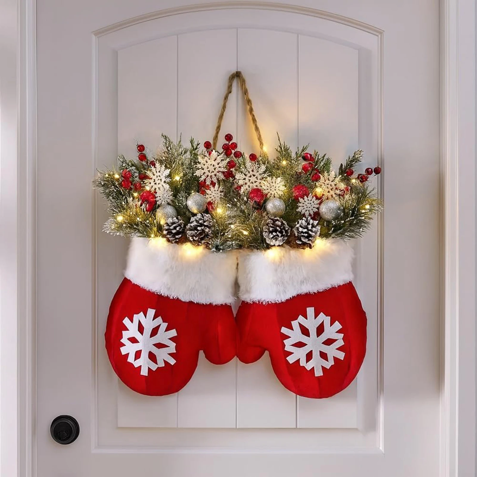 1.Christmas Theme Gloves Door Wreath: This creative Christmas gloves wreath features a festive design with integrated light strings, adding a warm holiday glow to your indoor or outdoor wall decor during the winter season.