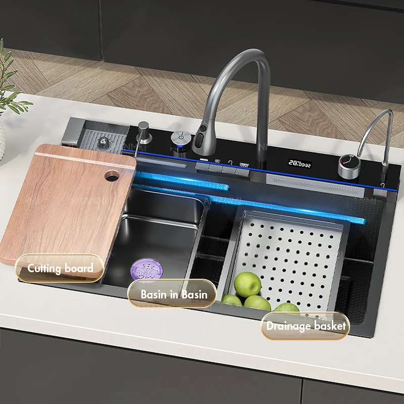 304 Stainless Steel Waterfall Kitchen Sink Large Single Slot Integrated Digital Display Faucet Set Soap Dispenser Cup Washer