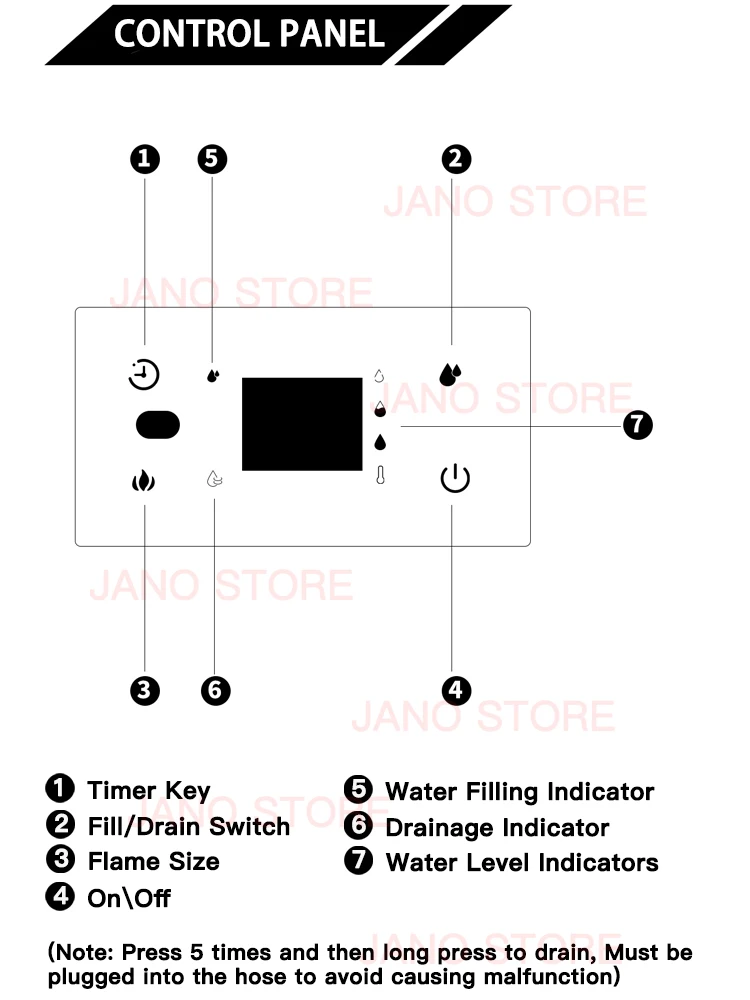 To extend the burner’s lifespan, use purified water to prevent dirt buildup that may cause the fireplace to malfunction after prolonged use.