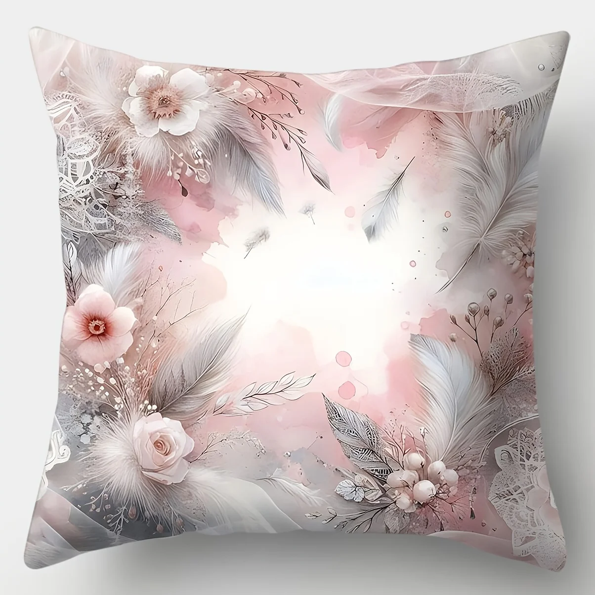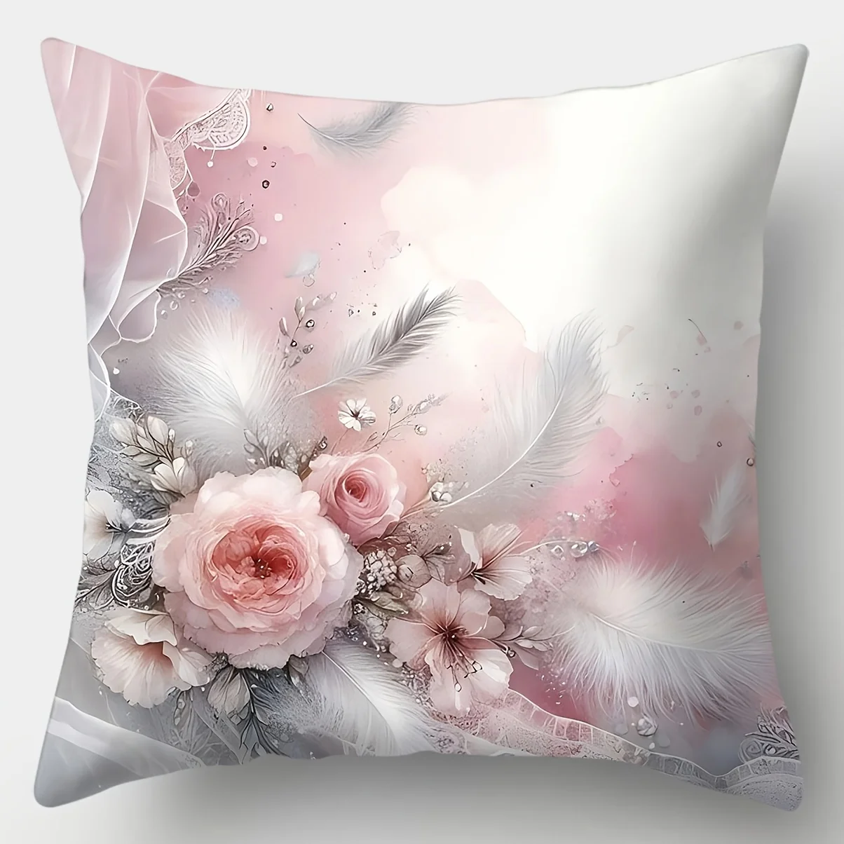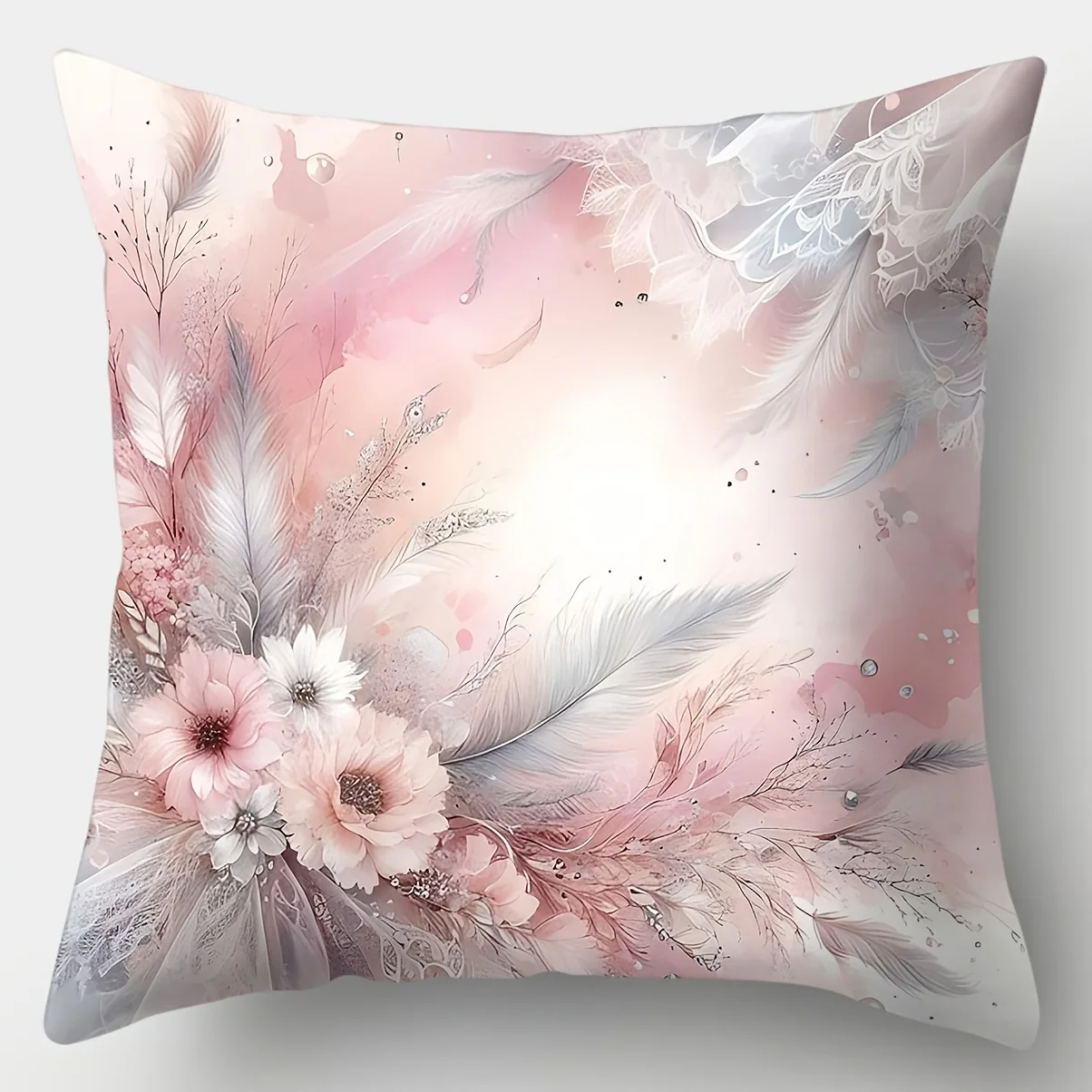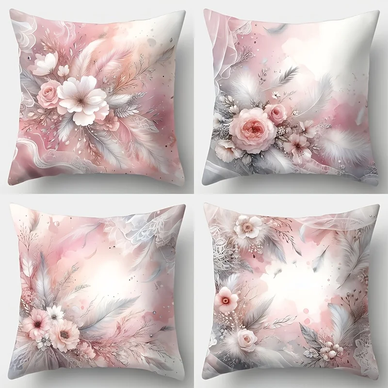 4pcs Pink Floral Feather Pillow Covers, Single-Sided Print, Decorative Lumbar Cushions for Sofa Waist Support
