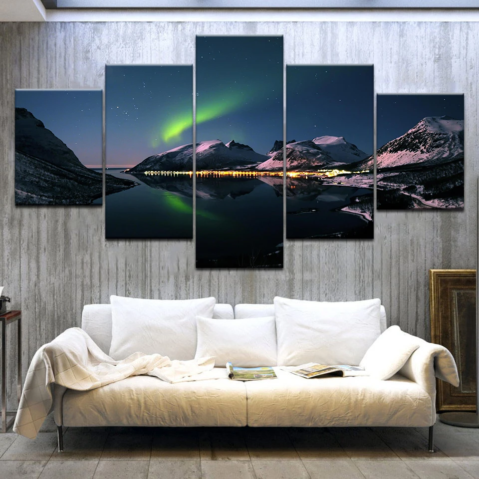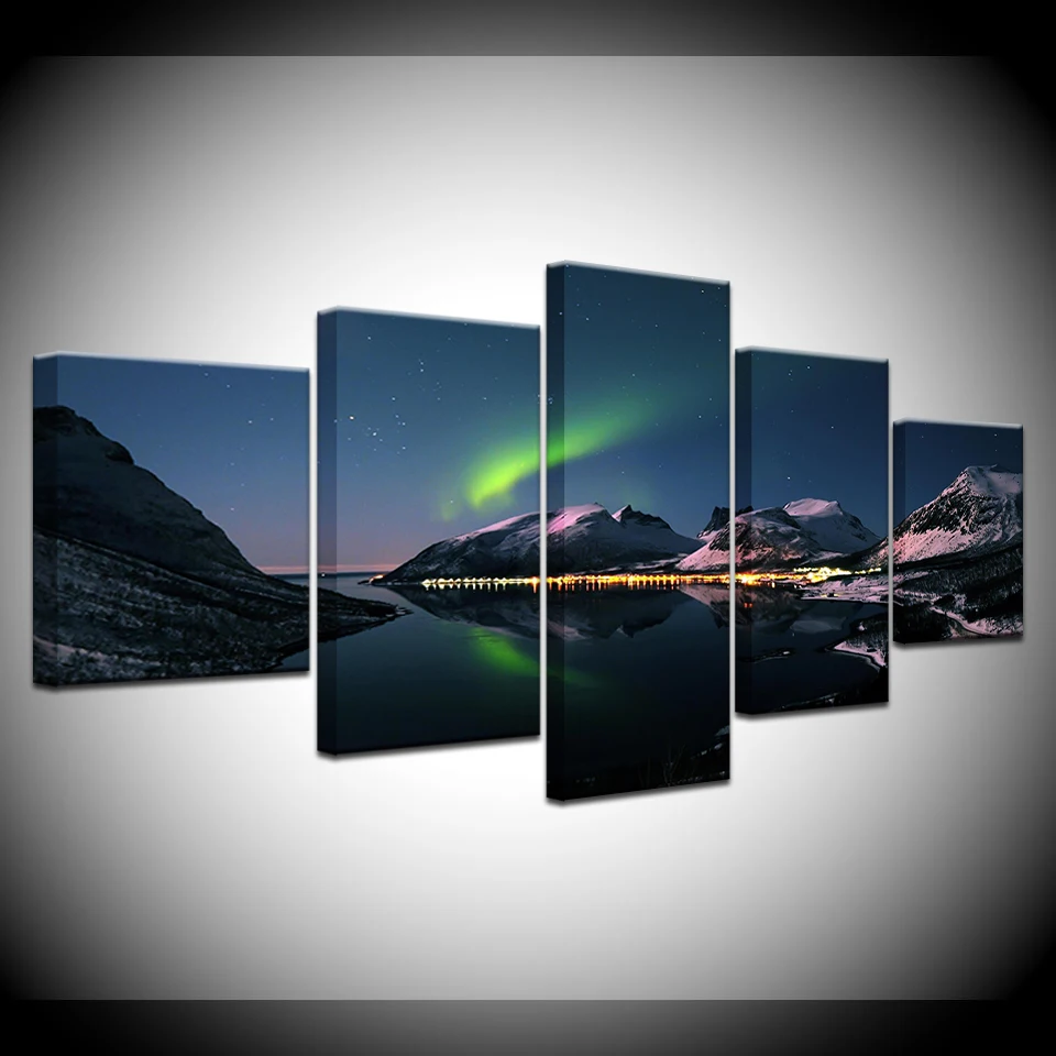5 Panel HD Print Snow mountain aurora borealis night Landscape Print On Canvas Art Painting For home living room decoration