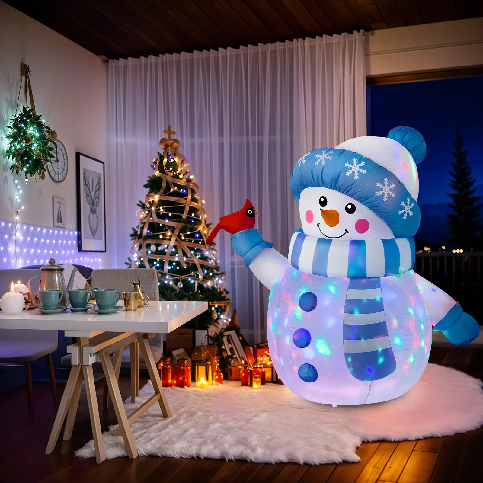 • 【5FT Inflatable Christmas Decorations】The cute blue snowman inflatable features a jolly expression with a carrot nose and a Christmas scarf wrapped around its neck,The cardinal bird is perched on the blue snowman’s hand, adding a touch of liveliness and charm to the overall design, a perfect addition to your winter wonderland display! What’s more, the blower, adapter, ground stakes and fastened ropes that everything needed for setup are all included in the package.