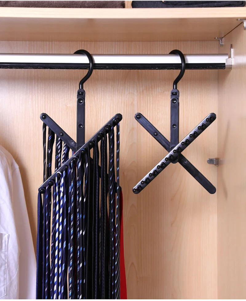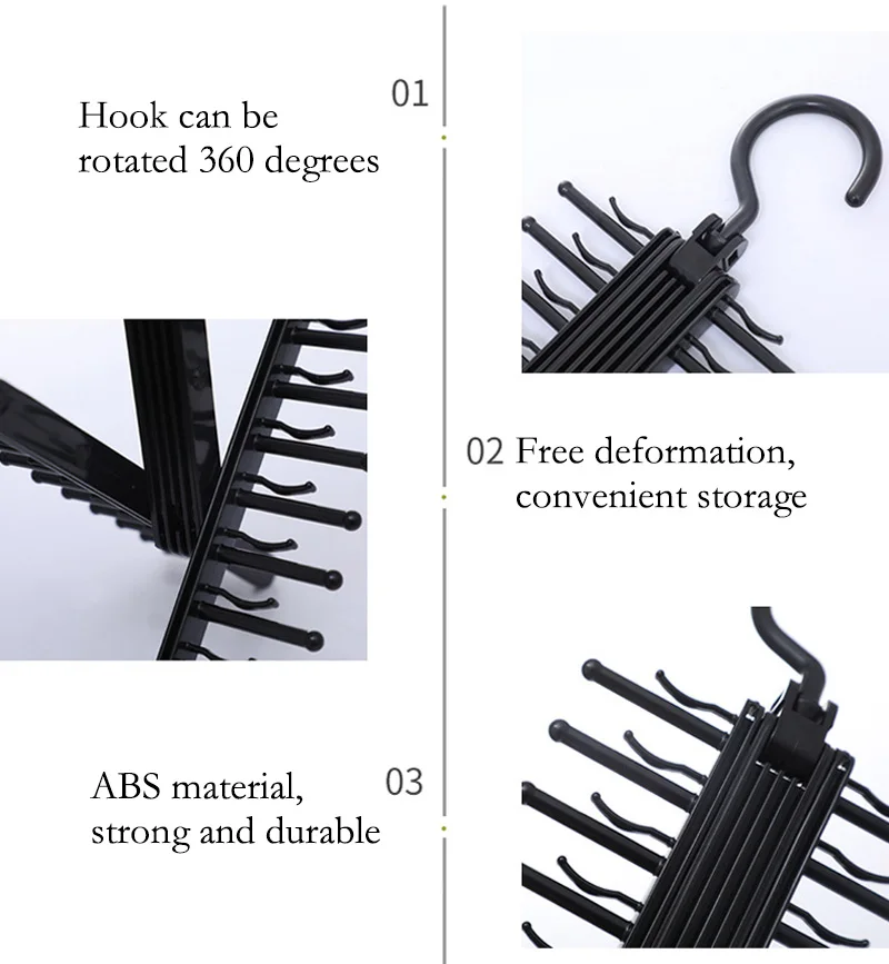1. Cross X and non-slip design: The black tie rack can store 20 ties, saving space, easy to use, modern and unique cross design, non-slip clip can keep the scarf off, hook hanging double-sided design, other designs are adjustable, portable, practical Detachable, foldable,