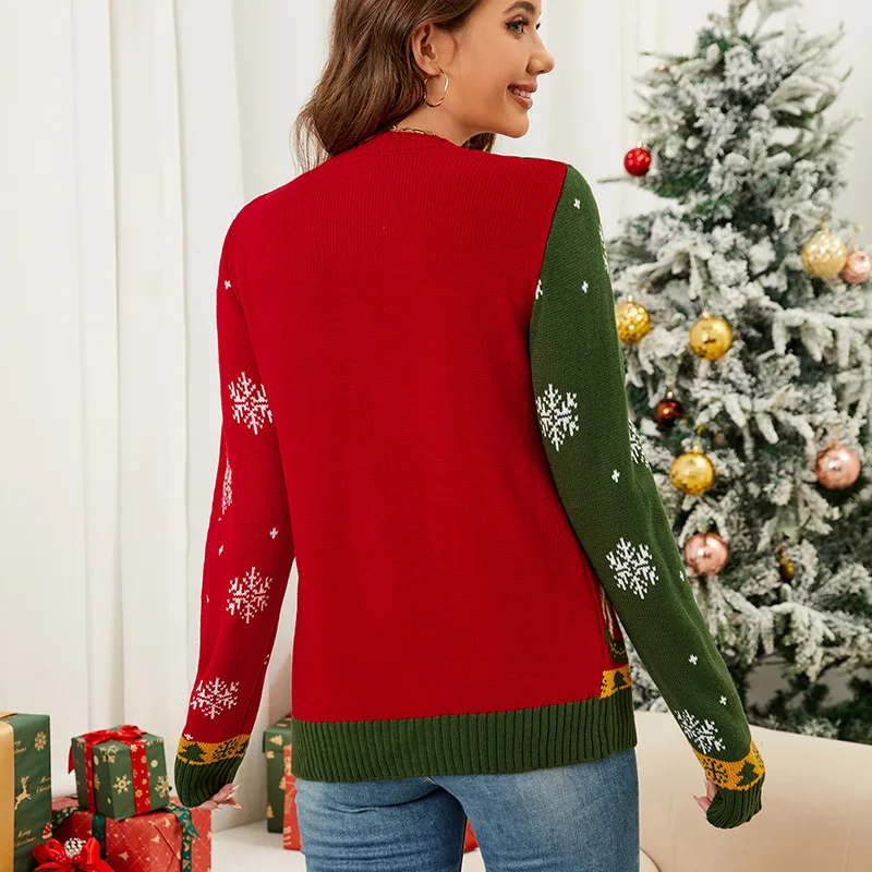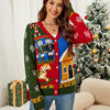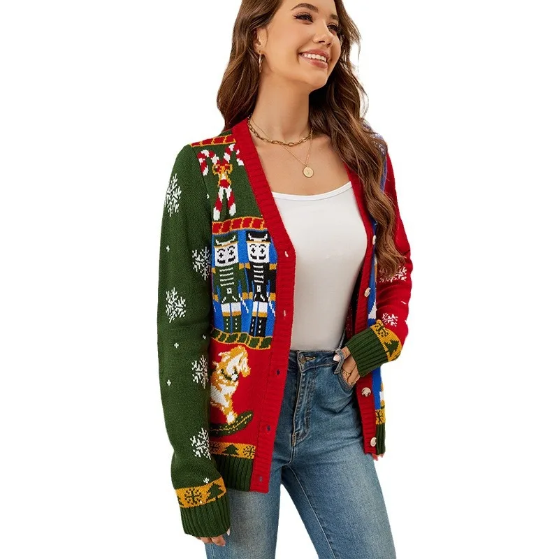 Autumn Winter Christmas Women Knitted V-neck Single-breasted Cardigan Spell Color Jacquard Long-sleeve Knit Women Sweater