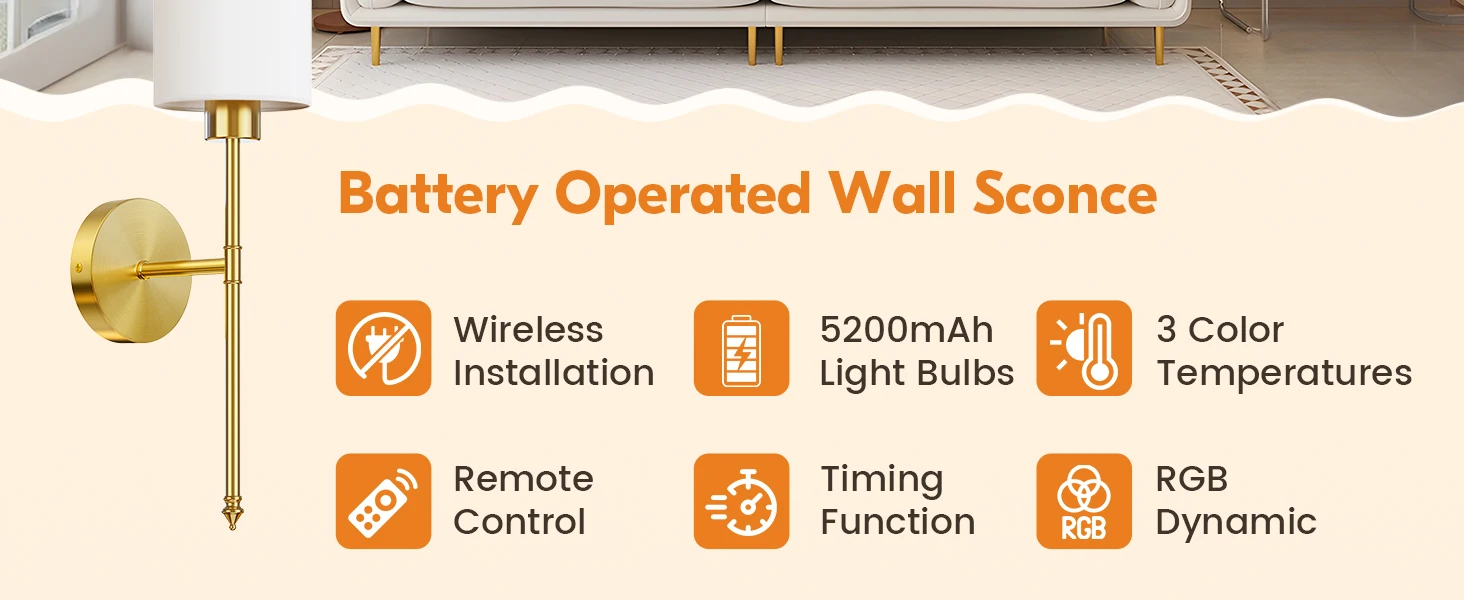 【Timer & Memory Function】: The rechargeable wall sconce offers four customizable timing modes. Automatically turning off at your preset duration prolongs battery life and minimizes wasted electricity. Our battery sconces remember your last setting. When switched back on, it seamlessly resumes the mode you left it in, eliminating the need for repetitive adjustments and saving you precious time.