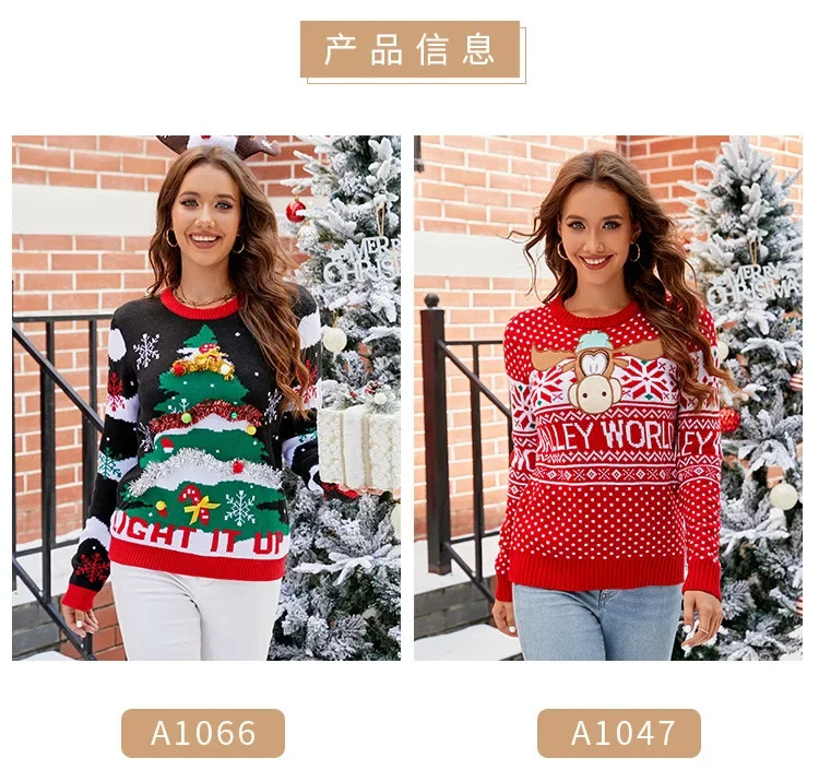 欧美跨境女装 卡通圆领毛衣 圣诞毛衣 圆领针织衫 圣诞树毛衣 圣