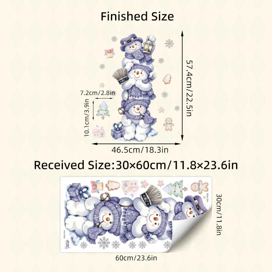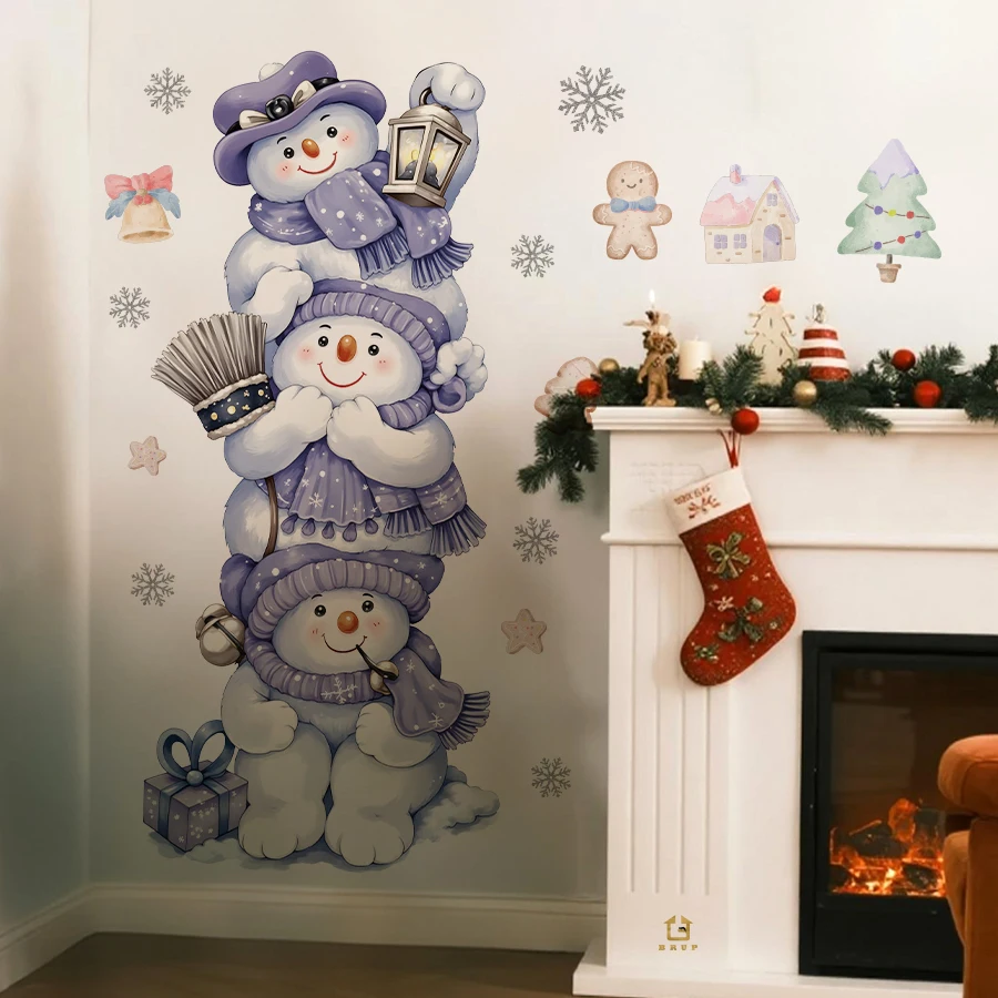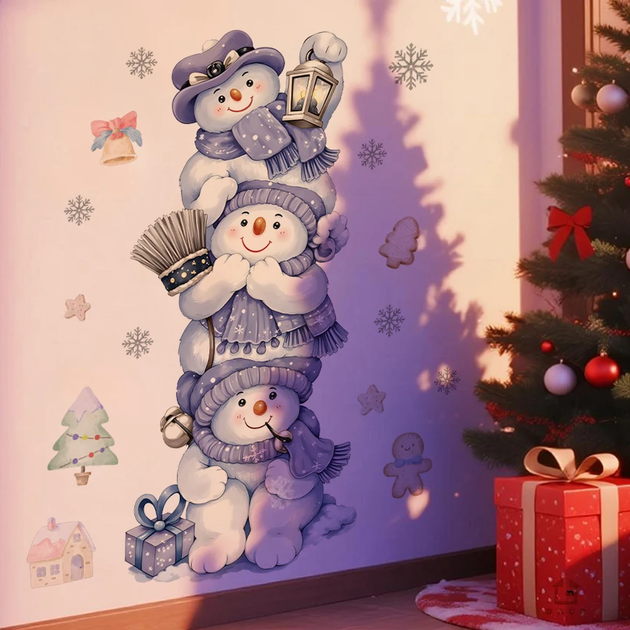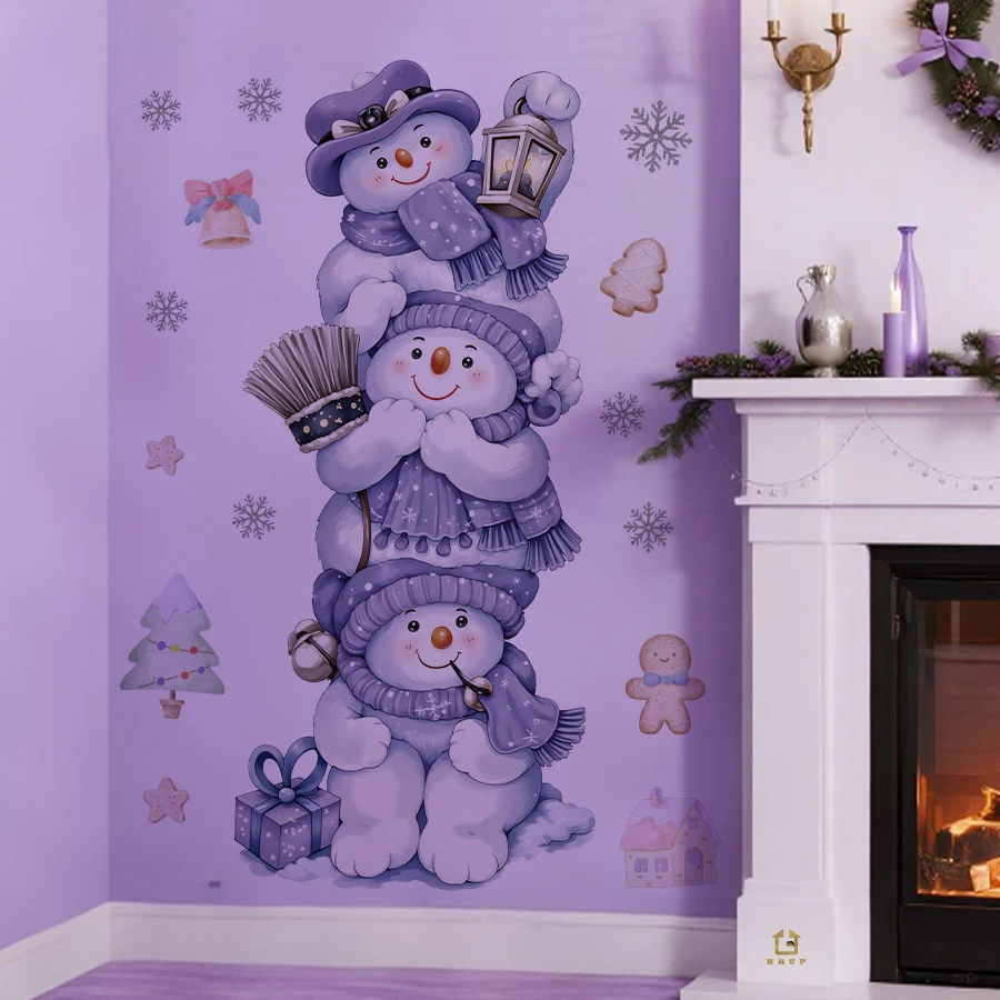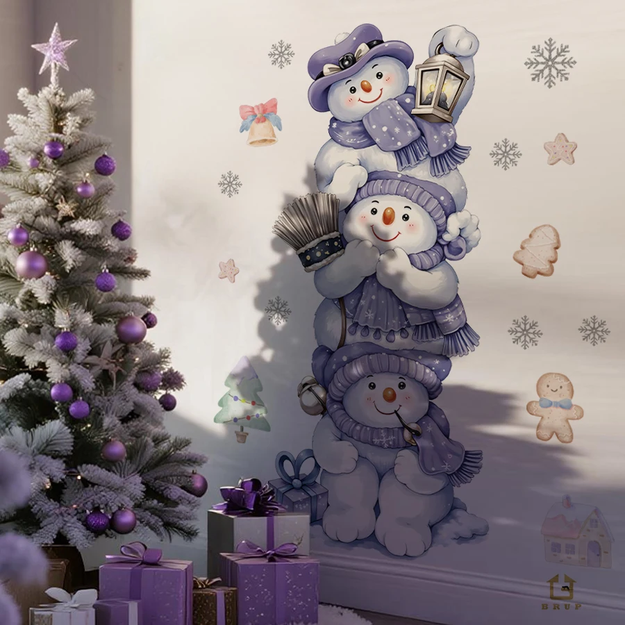 Cute Stacked Snowmen Christmas Wall Sticker With Purple Hats Removable PVC For Bedroom Living Room Decoration Wall Decal