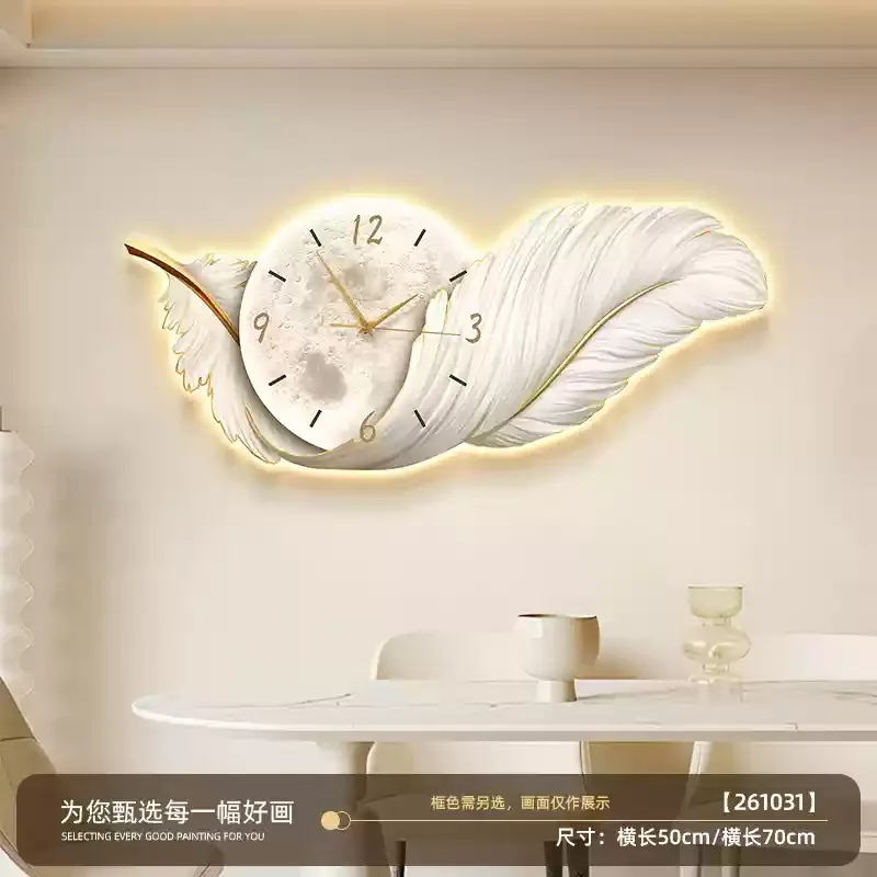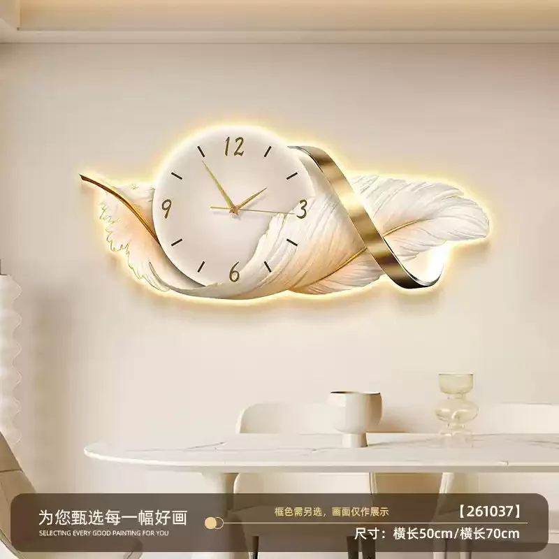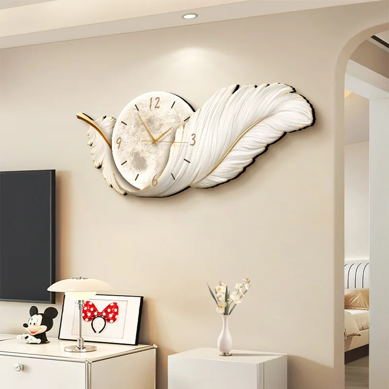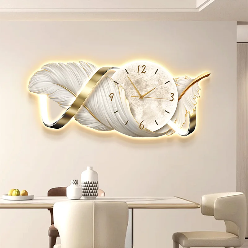 Feather Design Glowing Wall Clock With LED Light Luxury Silent Clock For Living Room Bedroom Home Decor