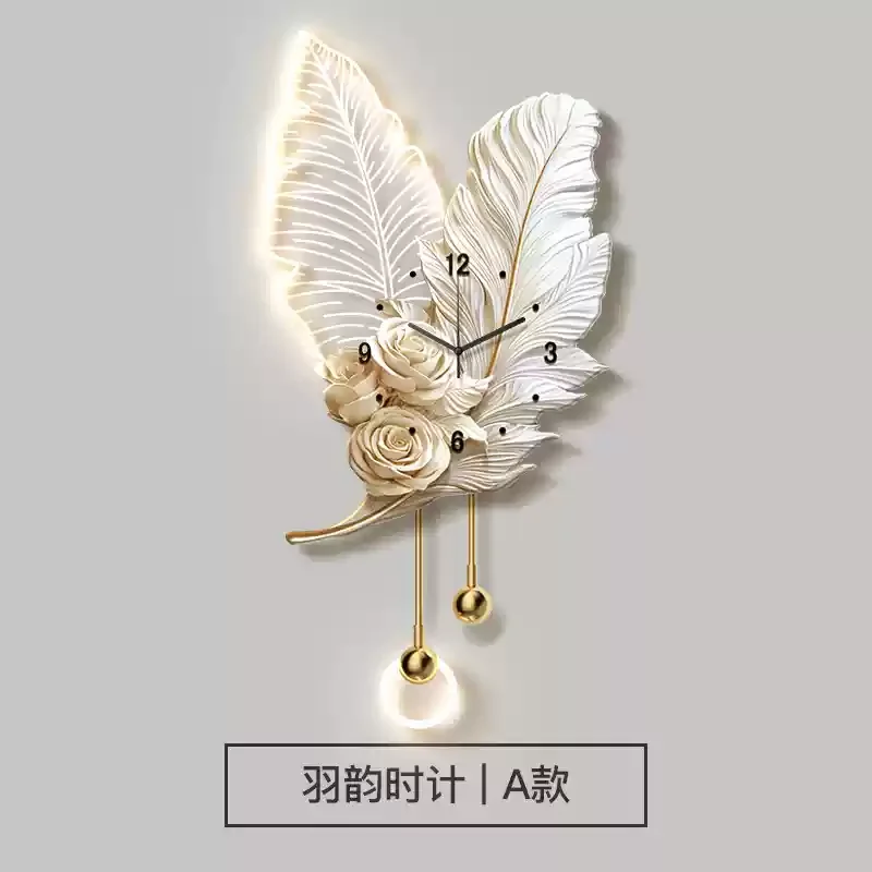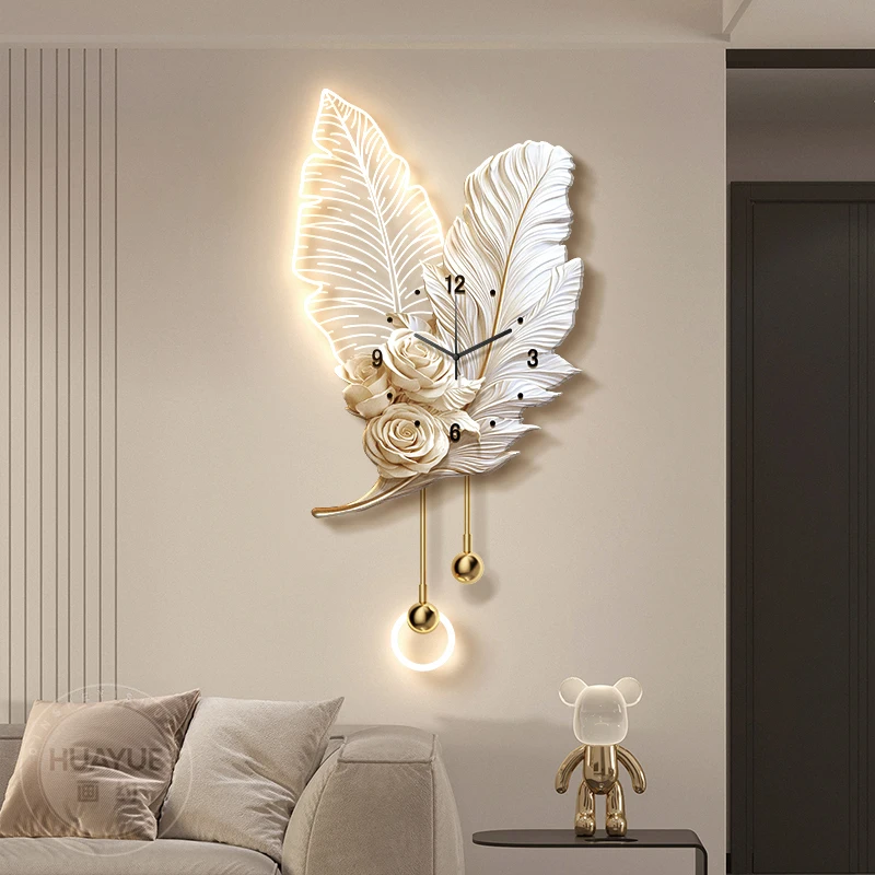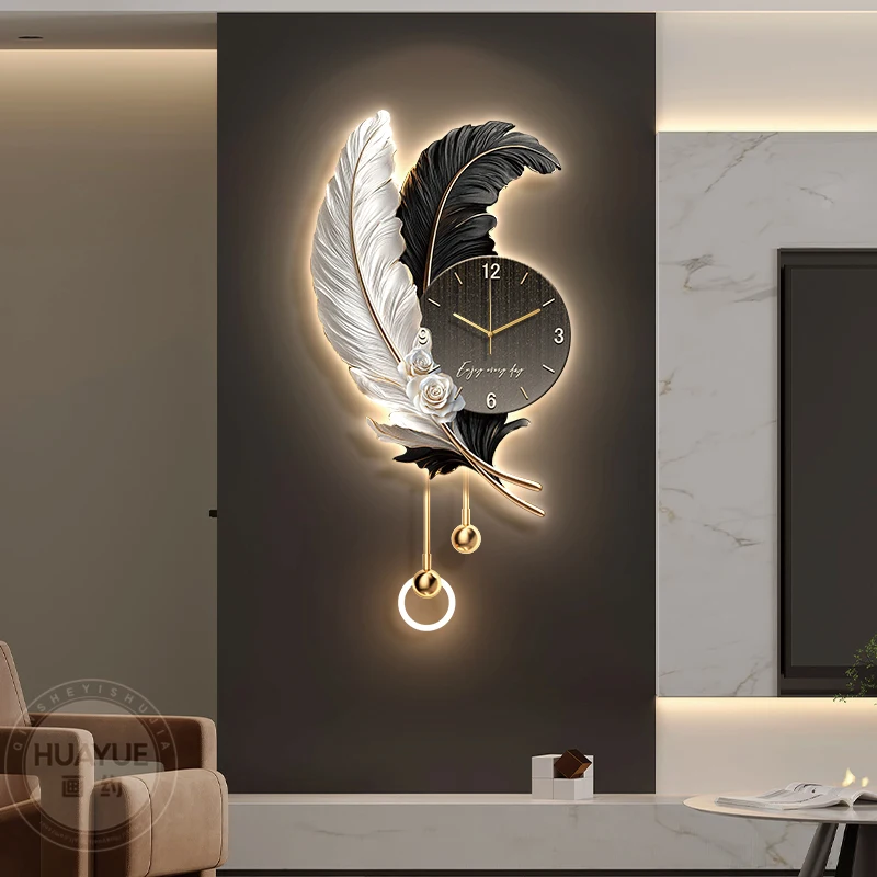 ​Feather Design Wall Clock With LED Lighting Luxury TV Background Art For Living Room Contemporary Wall Decor