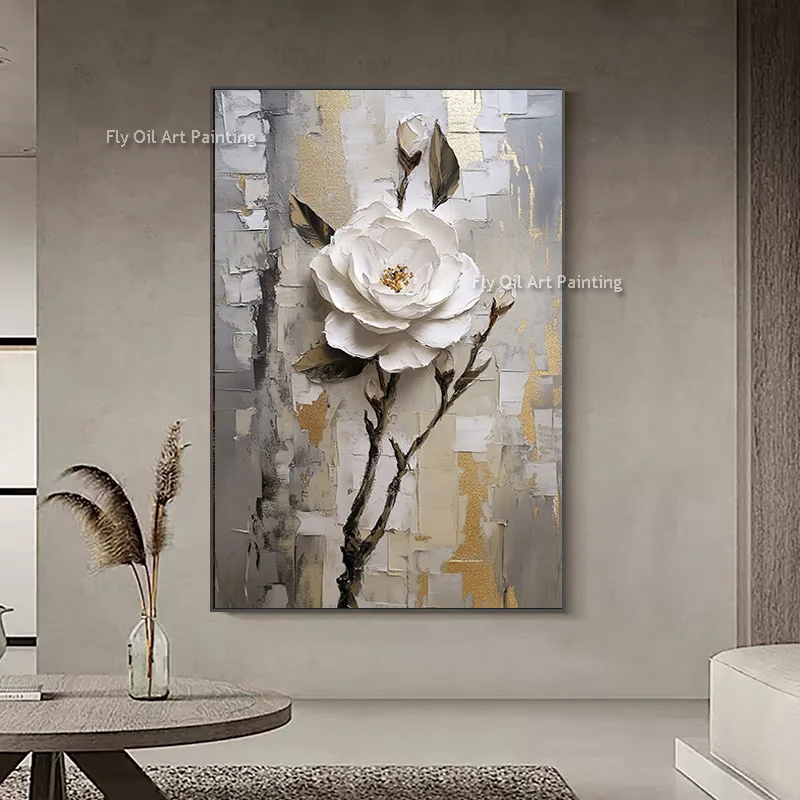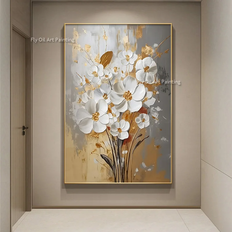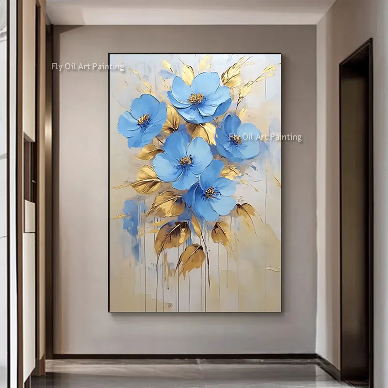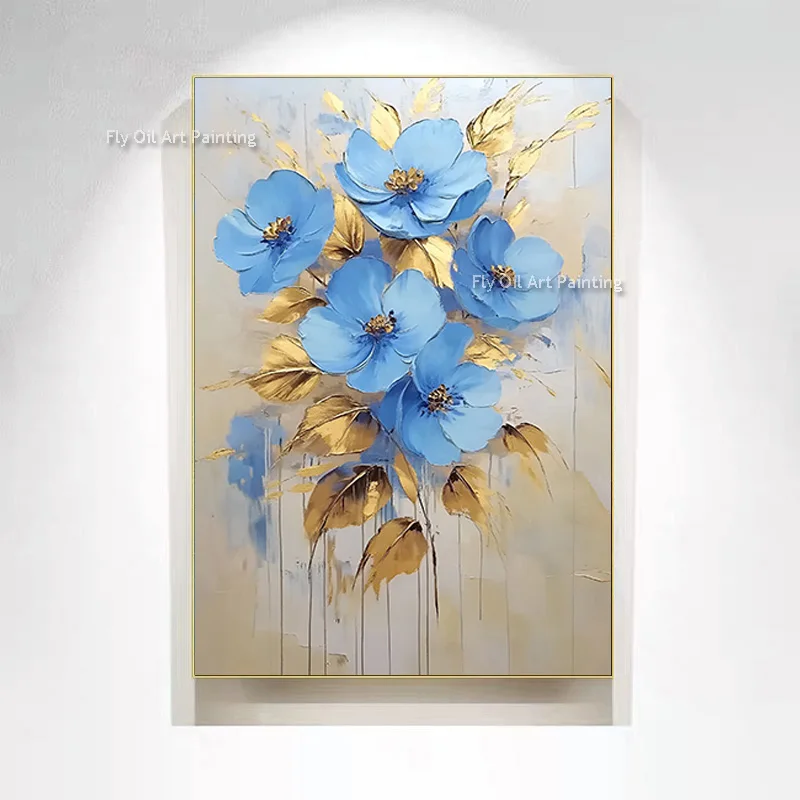 Golden Yellow And White Abstract Thick Flowers Canvas Wall Art Handpainted Blue Golden Florals Oil Painting Gray Artwork Decor