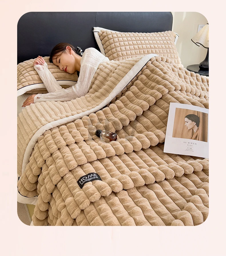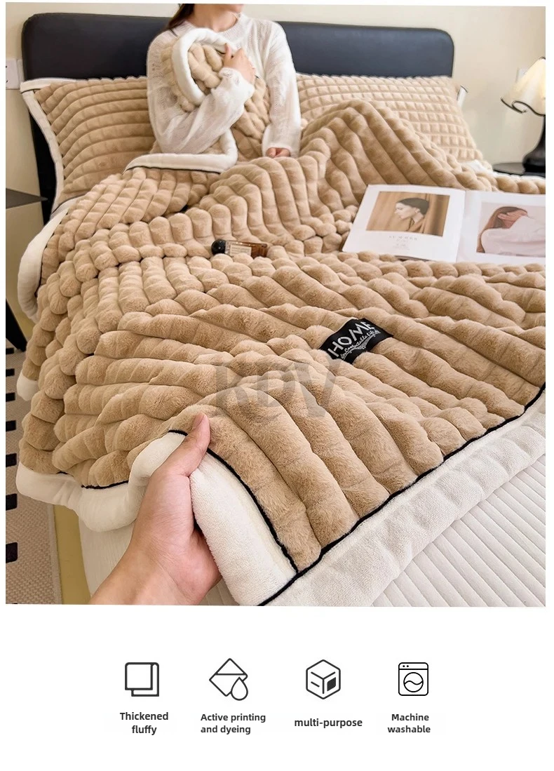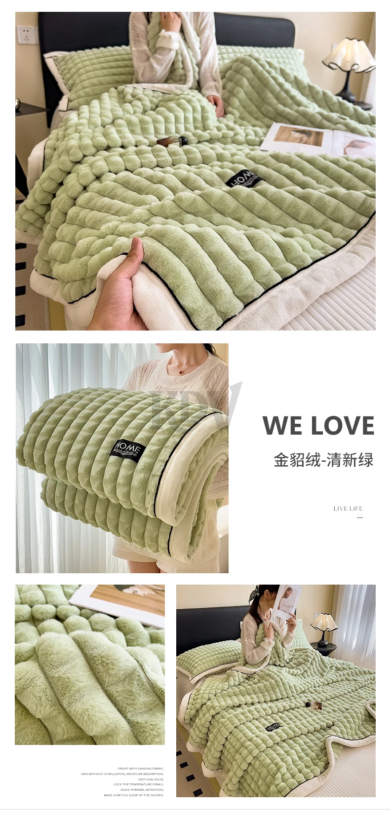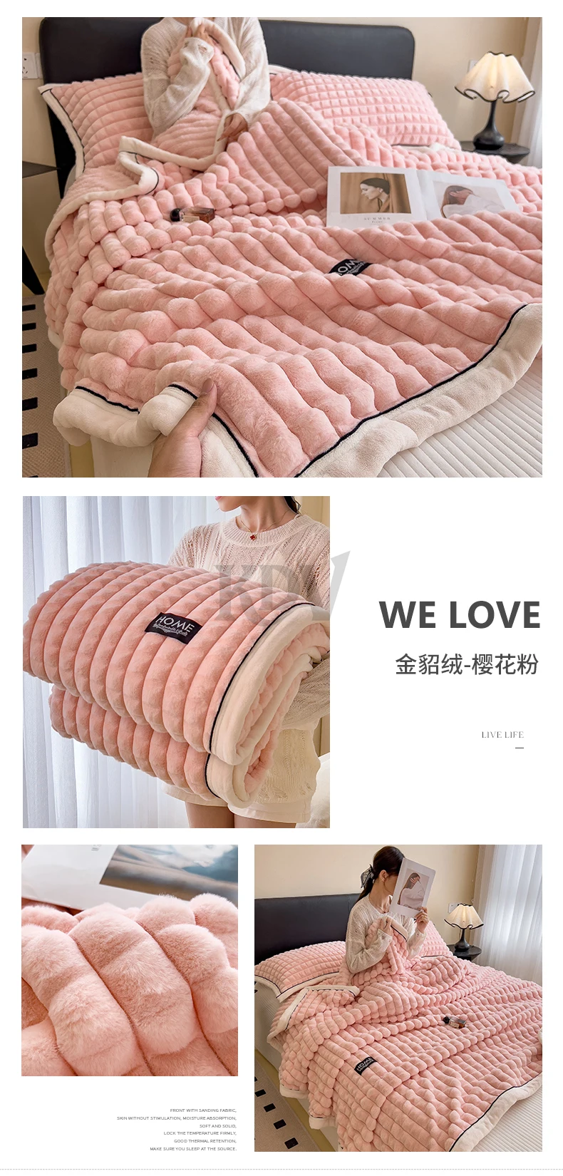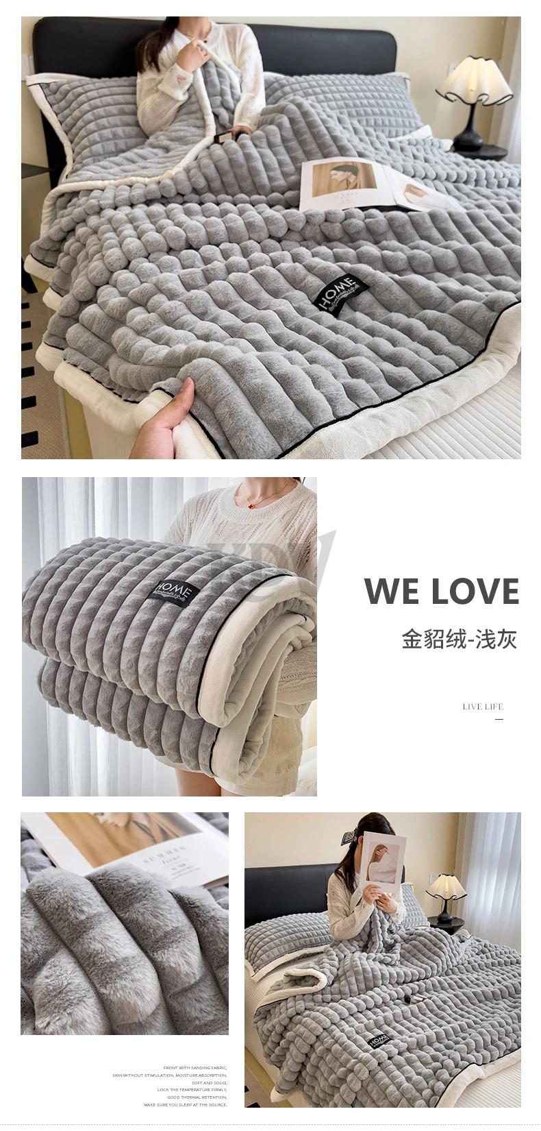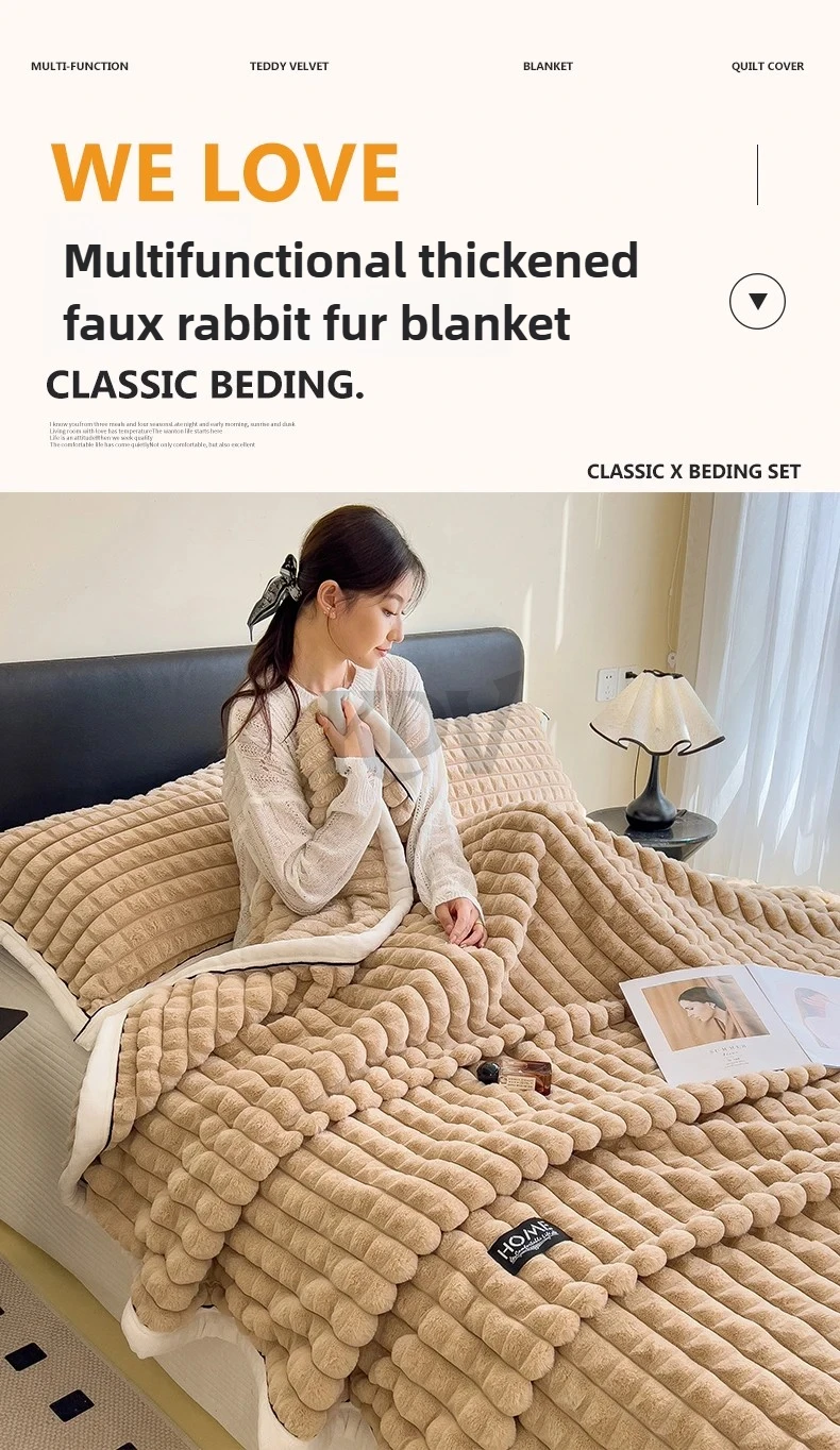 Luxury Double Layer Faux Rabbit Fur Throw Blanket Soft Warm White Striped Office Sofa Blankets and Pillow Cases Fluffy Bed Plaid