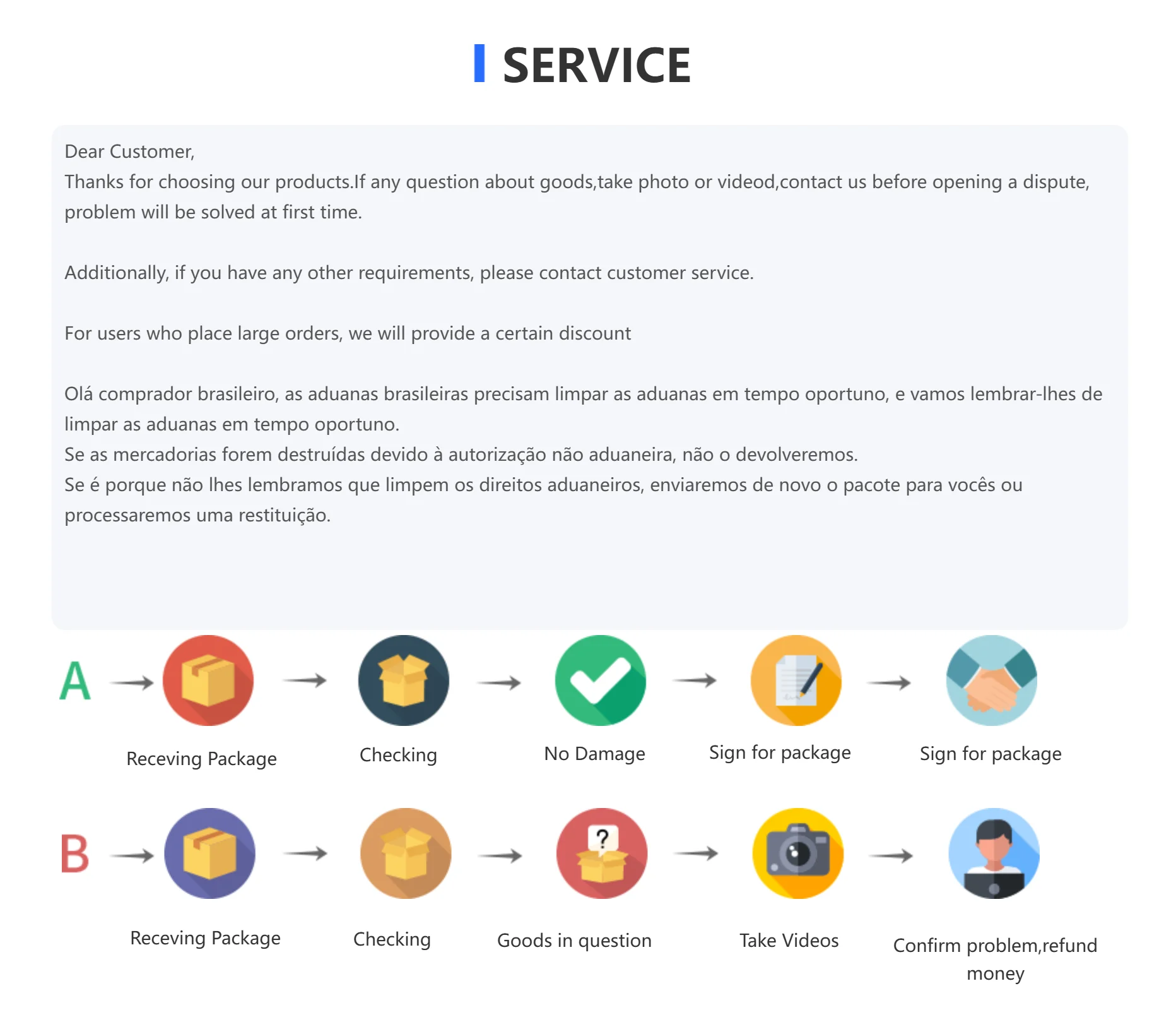 We are not responsible for any custom fees once the items have shipped. By purchasing our products, you consent that one or more packages may be shipped to you and may get custom fees when they arrive to your country.