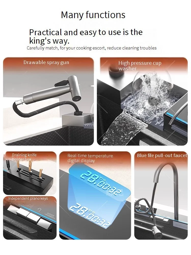 Stainless Steel Waterfall Kitchen Sink Digital Display Extra Large Single Bowl Multifunctional Household Vegetable Washing Sink