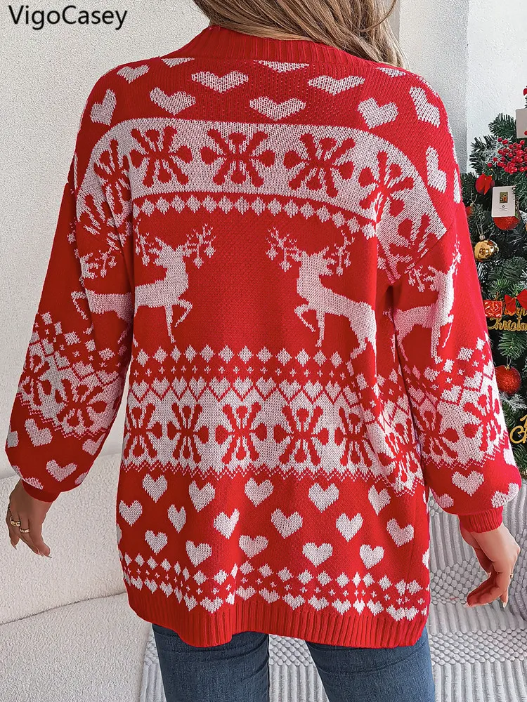 VigoCasey 2025 Autumn Print Christmas Sweater Cardigan Winter Women Casual Cardigan Lady Loose Long Sleeve Knitted Coat Outwears