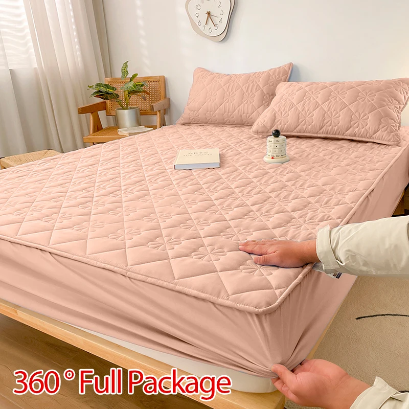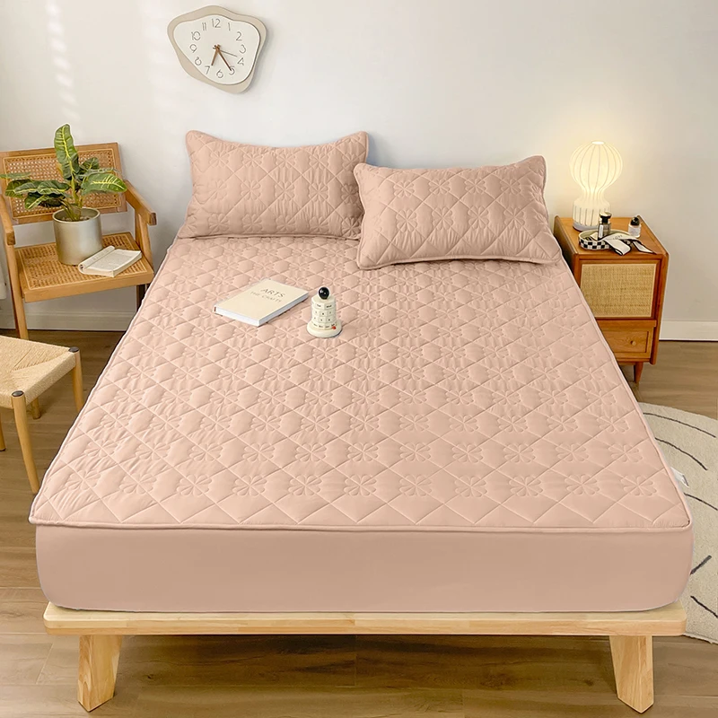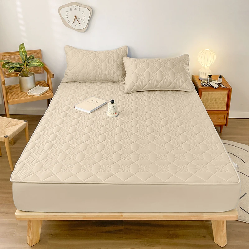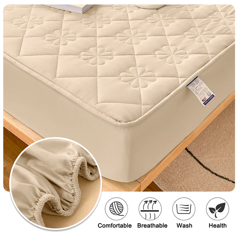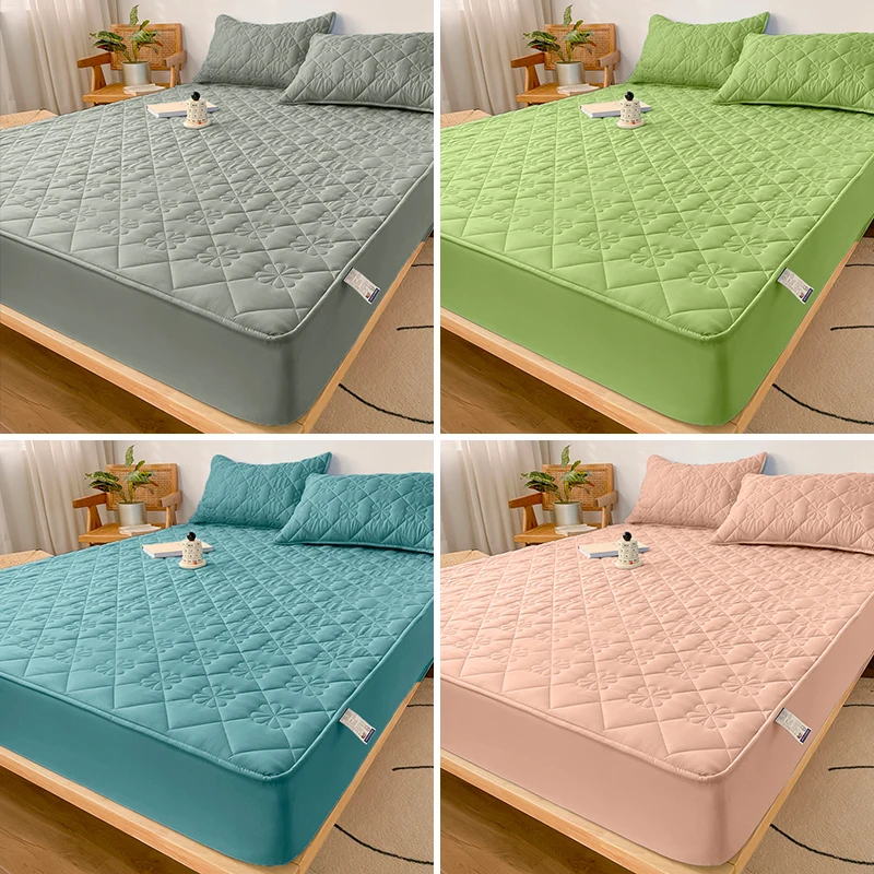 Waterproof Fitted Sheet with Elastic Band Solid Color Quilted Mattress Cover Soft Jacquard Bed Cover for Queen King Full Sizes